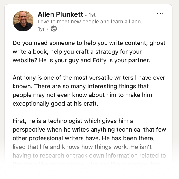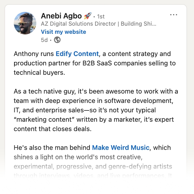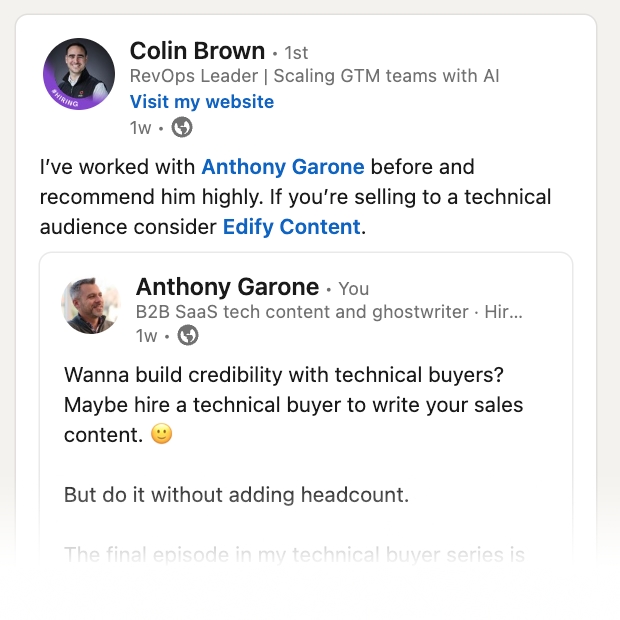 I run a technical content marketing agency called Edify Content, working primarily with technical B2B SaaS marketing and sales teams.